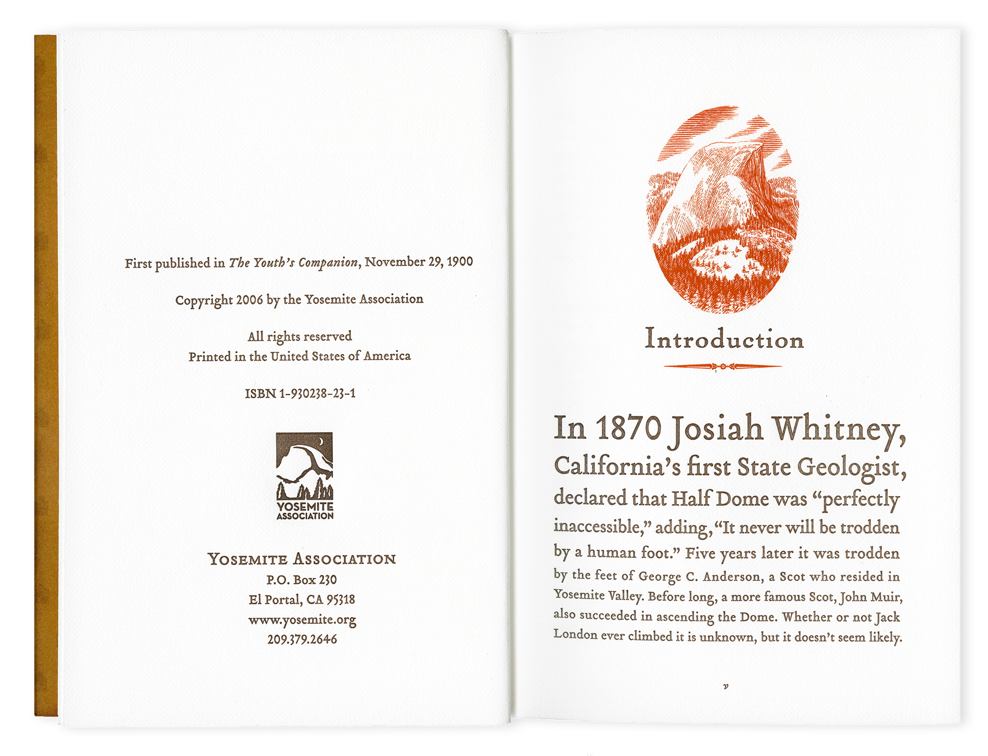 {Design Firm: Michael Osborne Design, Creative Director: Michael Osborne, Illustrator: Larry Duke} A story of two men and their thrilling experience climbing Half Dome, a granite dome in Yosemite National Park. A Numbered Letterpress-Printed Special Edition from The Yosemite Association.