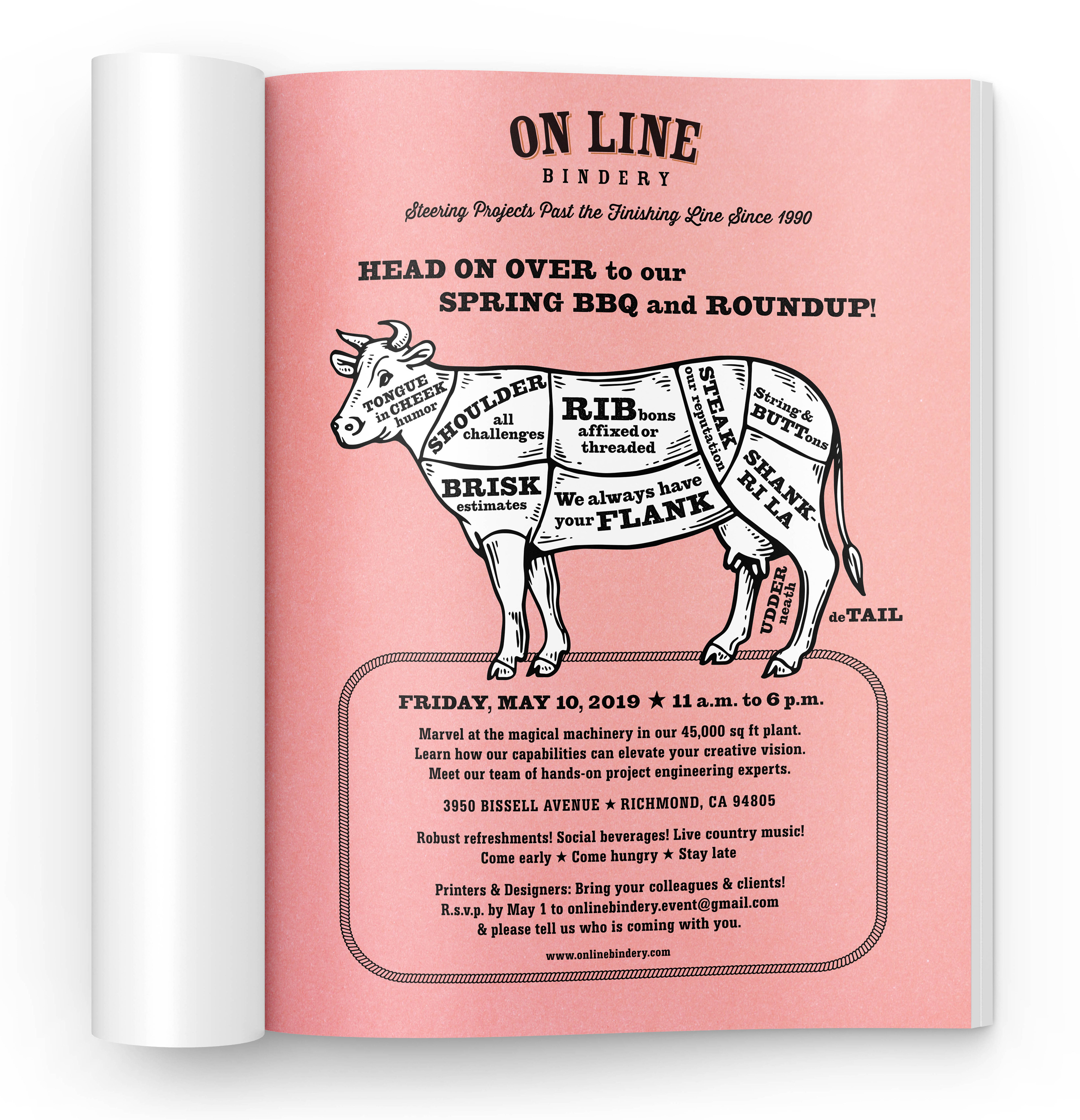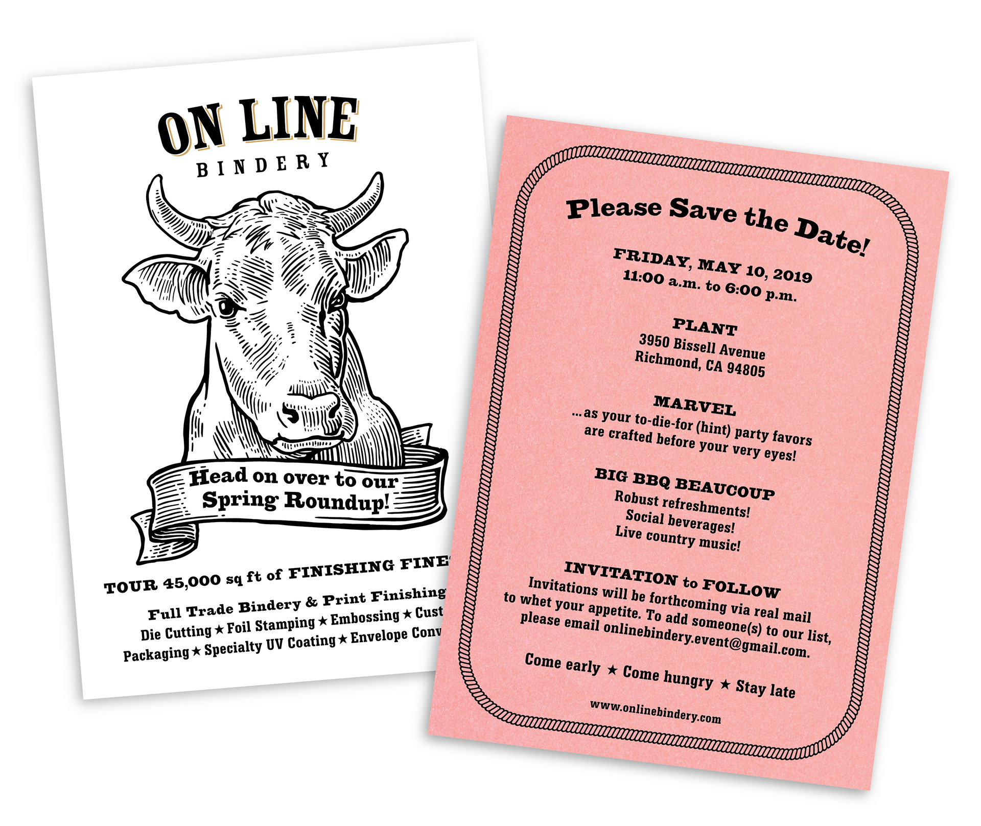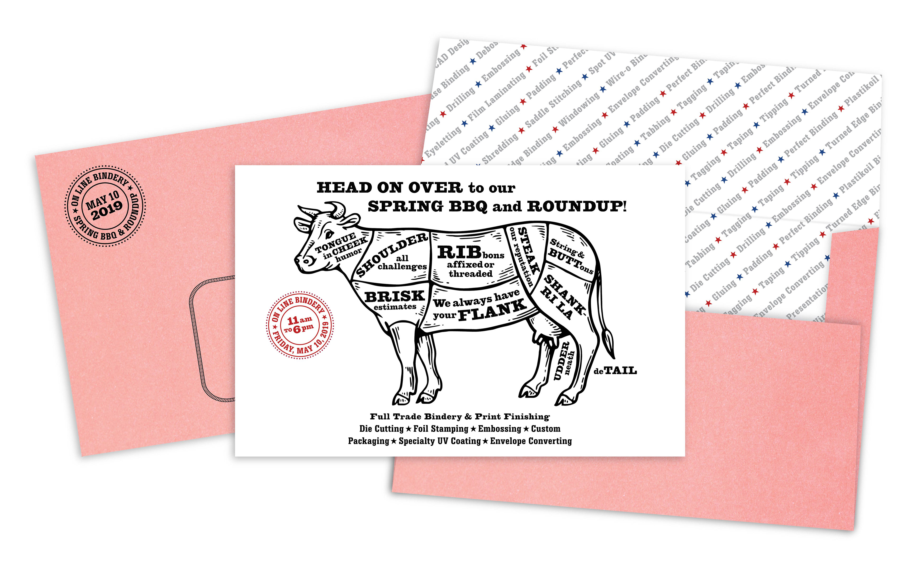 {Creative Director, Project Manager and Copywriter: Alyson Kuhn} Materials for On Line Bindery’s Spring Roundup and BBQ, an open house showcasing On Line’s capabilities as a full trade bindery and print finishing resource.